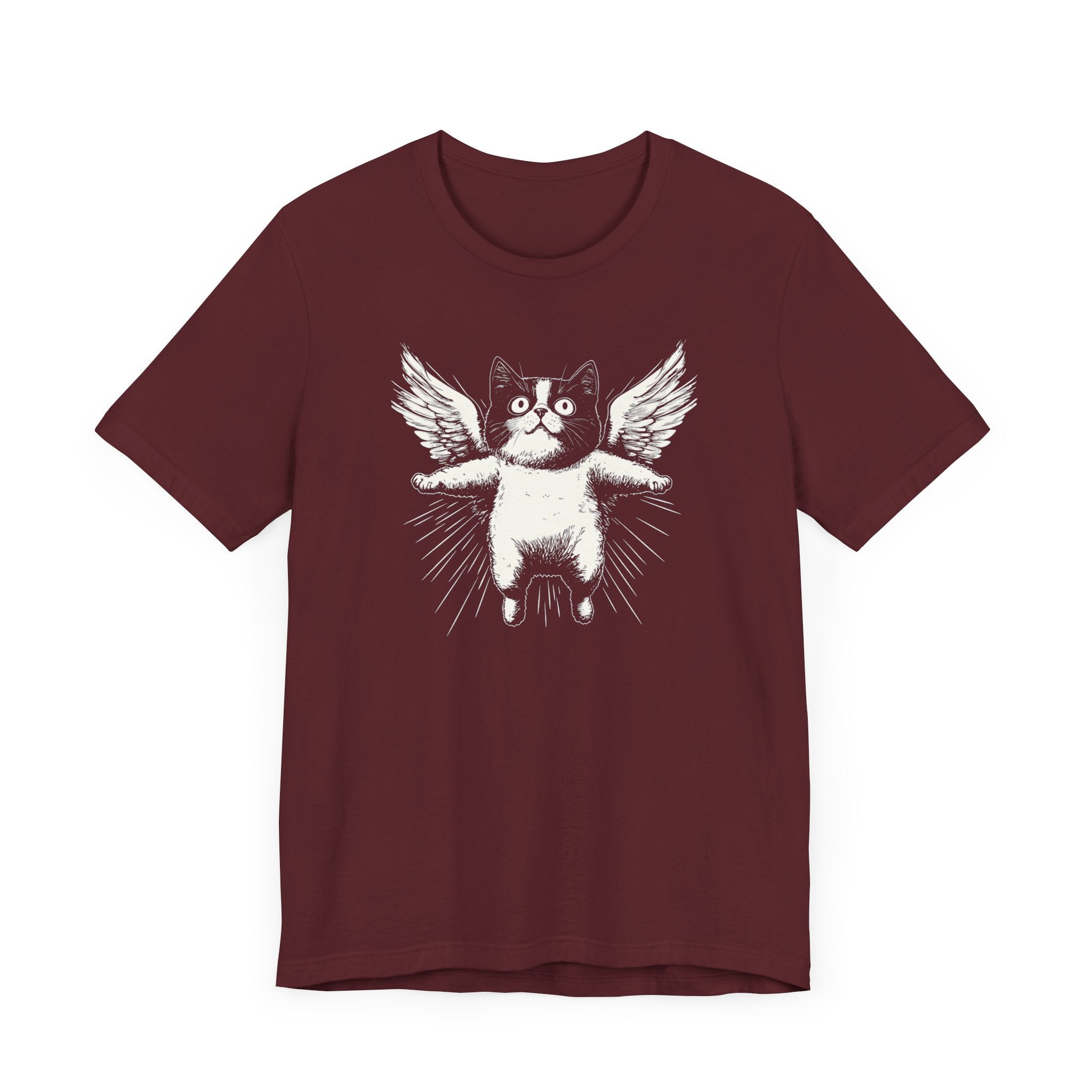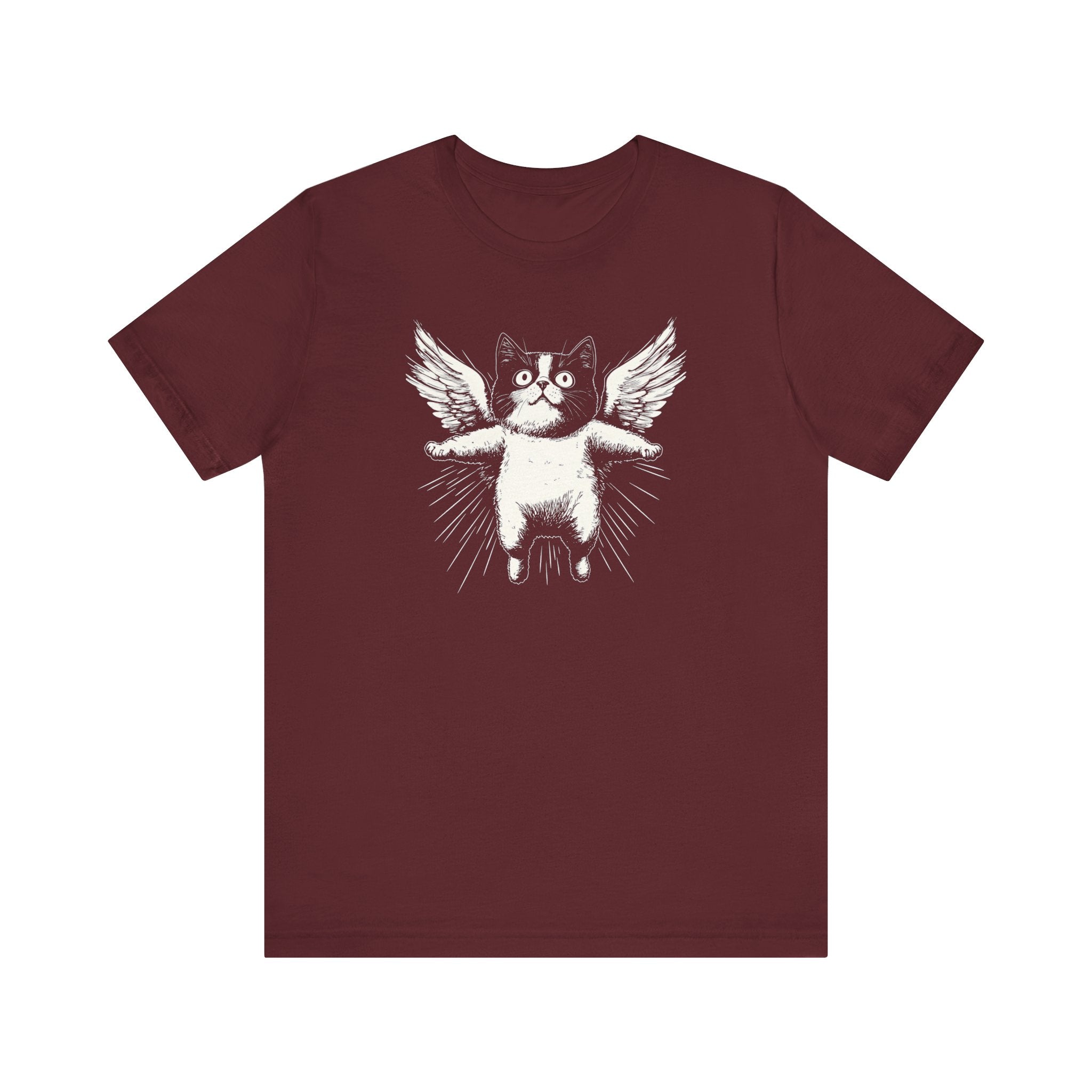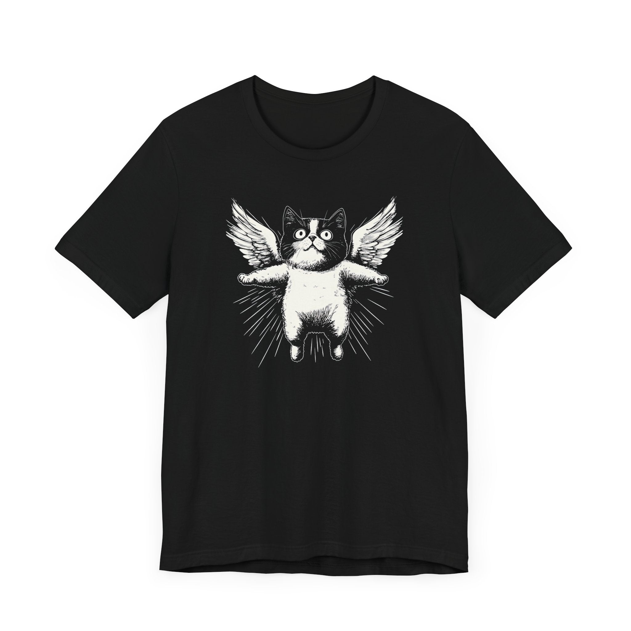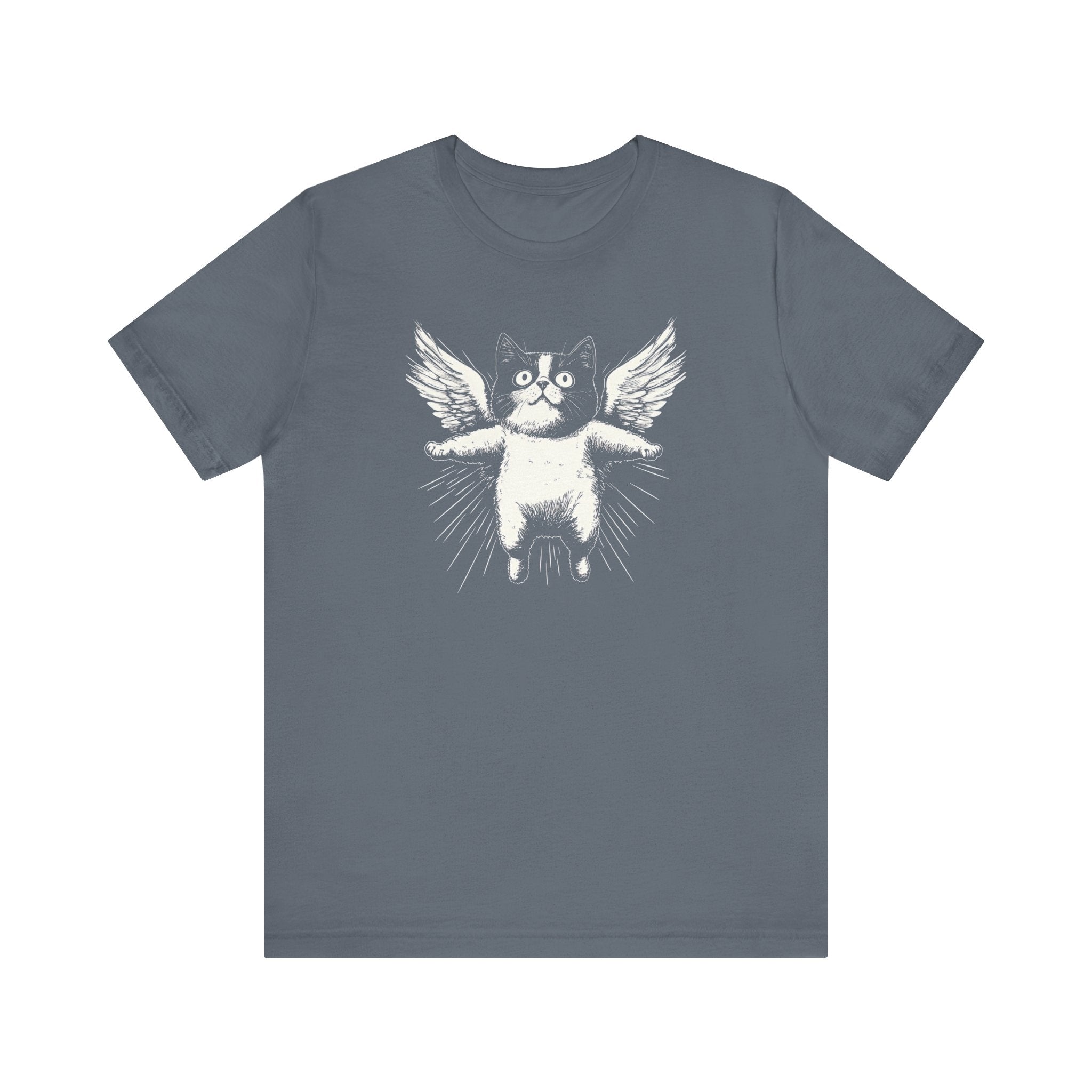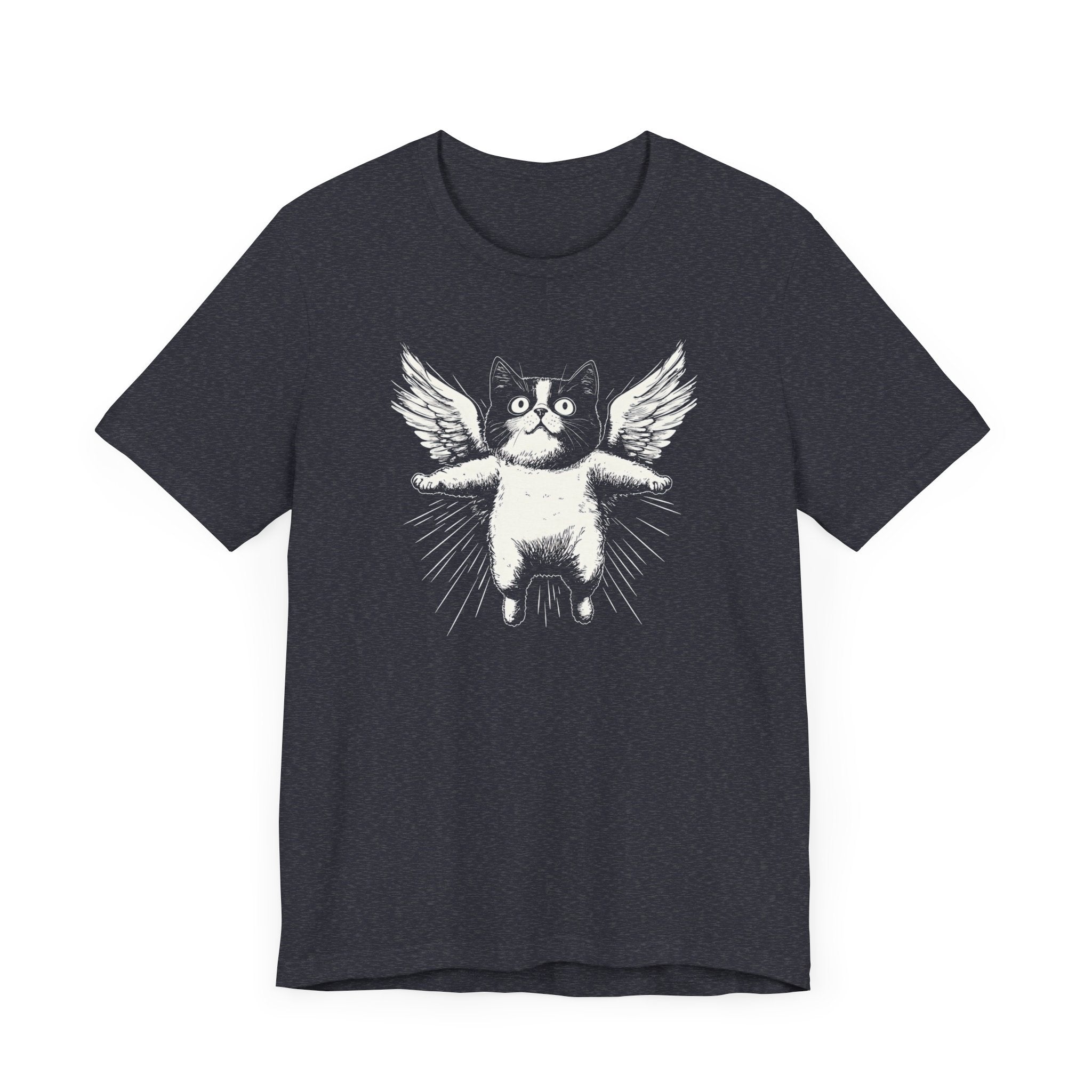Lift your spirits with this adorable “Flying Angel Cat with Wings” graphic tee! 😻✨ Perfect for cat lovers who enjoy quirky and cute designs, this tee is sure to bring a smile to your face. Whether you’re lounging at home or out and about, this shirt is a fun way to show off your love for all things feline! 🐾💫 Why You’ll Love It: 👕 Ultimate Comfort: Made with 100% Airlume combed and ring-spun cotton, this tee offers a lightweight (4.2 oz/yd² or 142 g/m²) and breathable fabric that’s perfect for both active and leisure wear. 👔 Versatile Style: The retail fit and classic crew neckline make this shirt perfect for casual outings and semi-formal settings alike. Accessorize easily to create your unique look! 👍 Durable Quality: Ribbed knit collars and tapered shoulders ensure a better fit over time, while dual side seams hold the garment’s shape longer, wash after wash. 🌱 Ethically Made: Bella+Canvas products are manufactured in the USA and internationally in a humane, no-sweat-shop, sustainable manner. Proudly part of the Fair Labor Association and Platinum WRAP certified. 🔖 No Irritation: Featuring a tear-away label for added comfort, say goodbye to annoying tags! Fabric Details: 🧵 Solid Colors: 100% Airlume combed and ring-spun cotton 🧵 Ash and Heather Prism: 99% Airlume combed and ring-spun cotton, 1% polyester 🧵 Heather and Solid Blends: 52% cotton, 48% polyester 🧵 Athletic Heather and Black Heather: 90% cotton, 10% polyester Perfect For: 🎁 Gift Giving: An excellent gift for birthdays, holidays, or any special occasion for cat and fashion lovers. 🌳 Everyday Wear: Whether you’re running errands, meeting friends, or just relaxing at home, this shirt is your go-to choice. Embrace your love for bold and unique designs with our Angry Cat Vintage Style T-Shirt. Add it to your collection today! 🛒