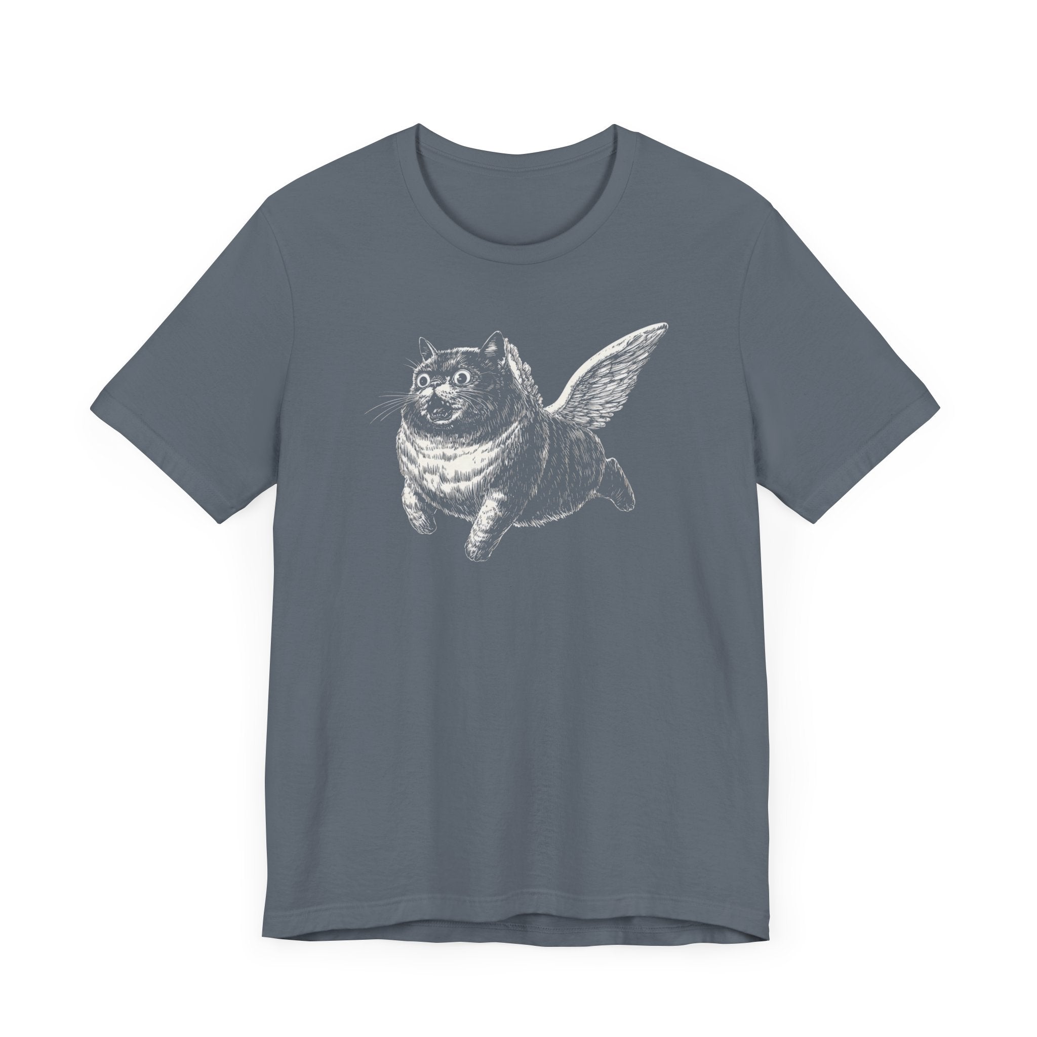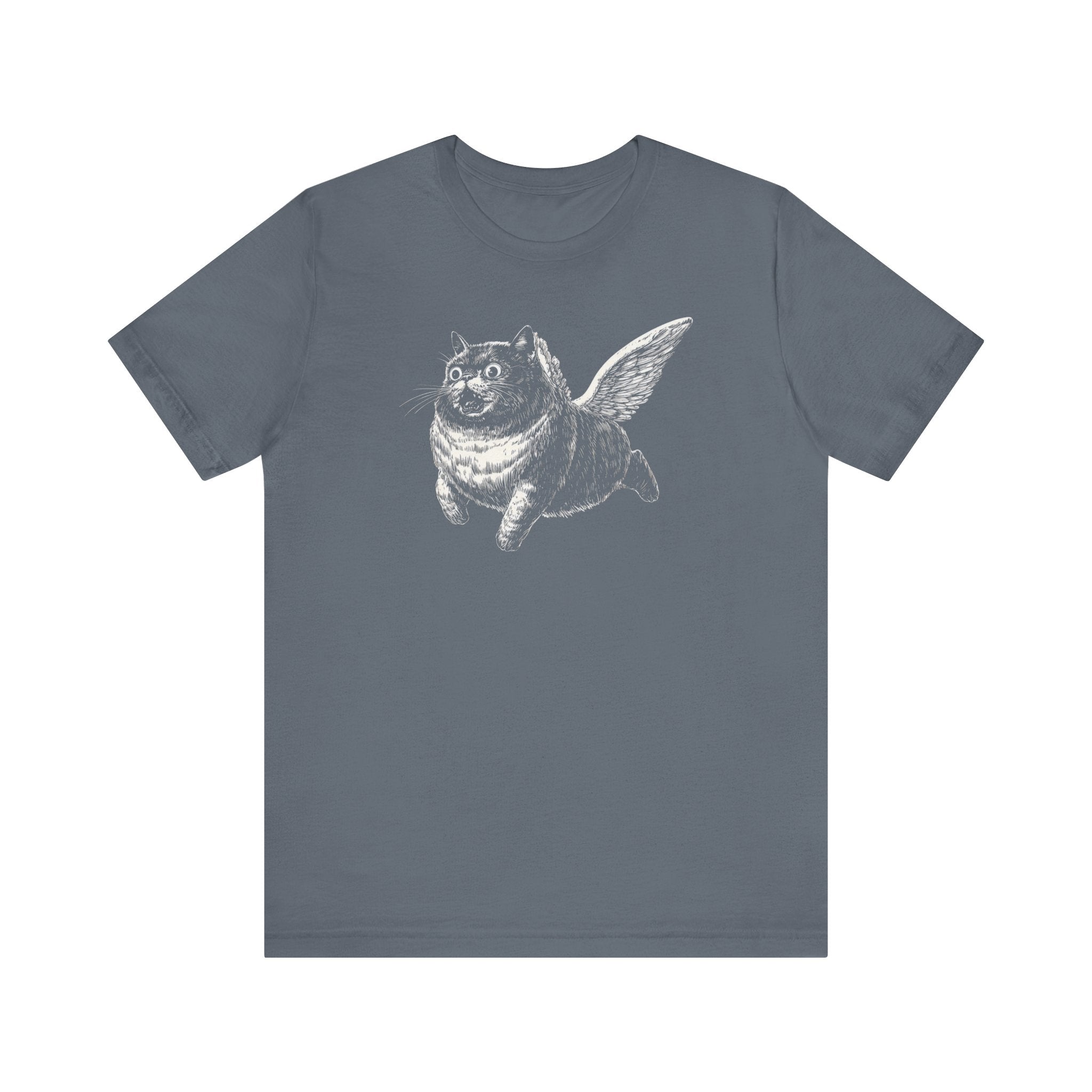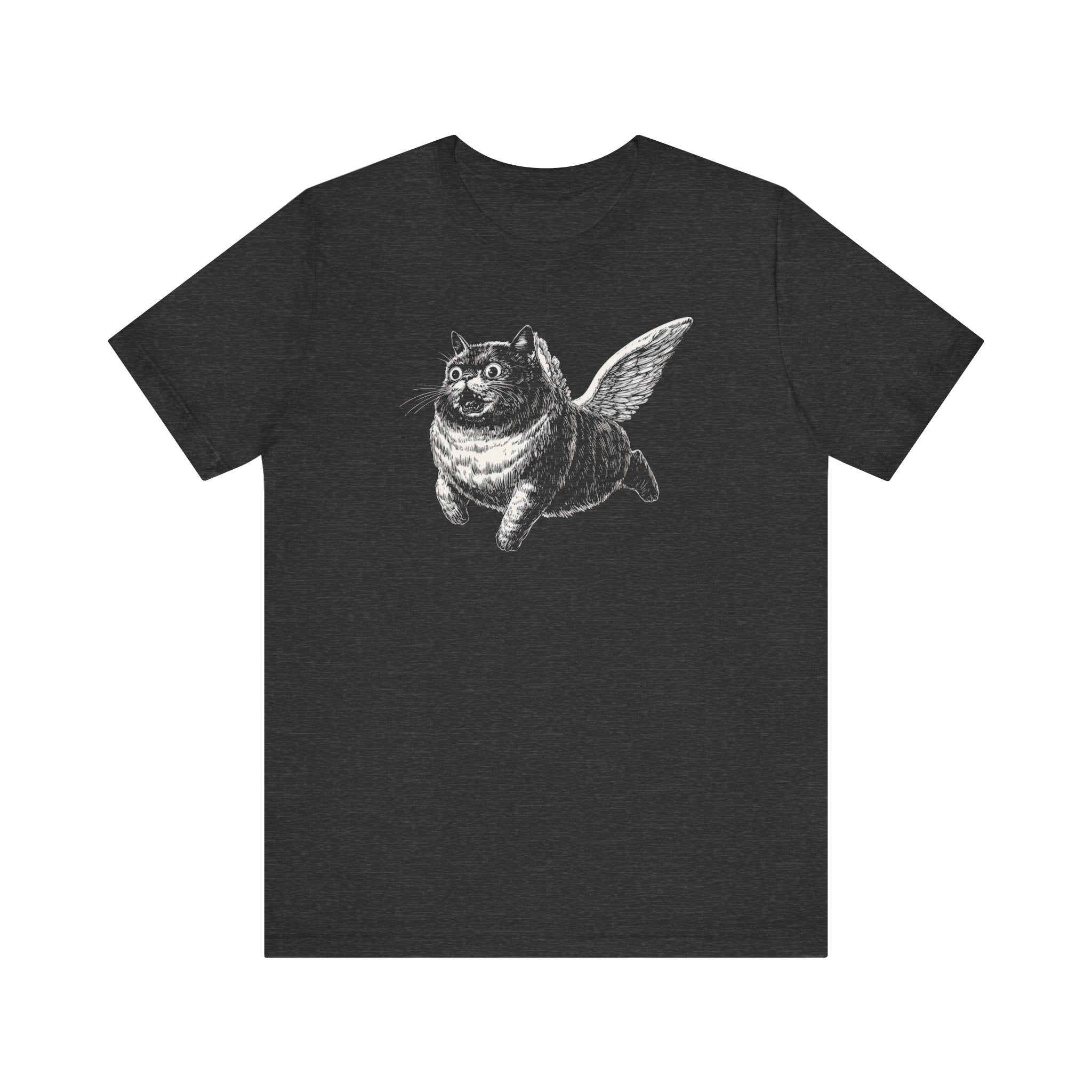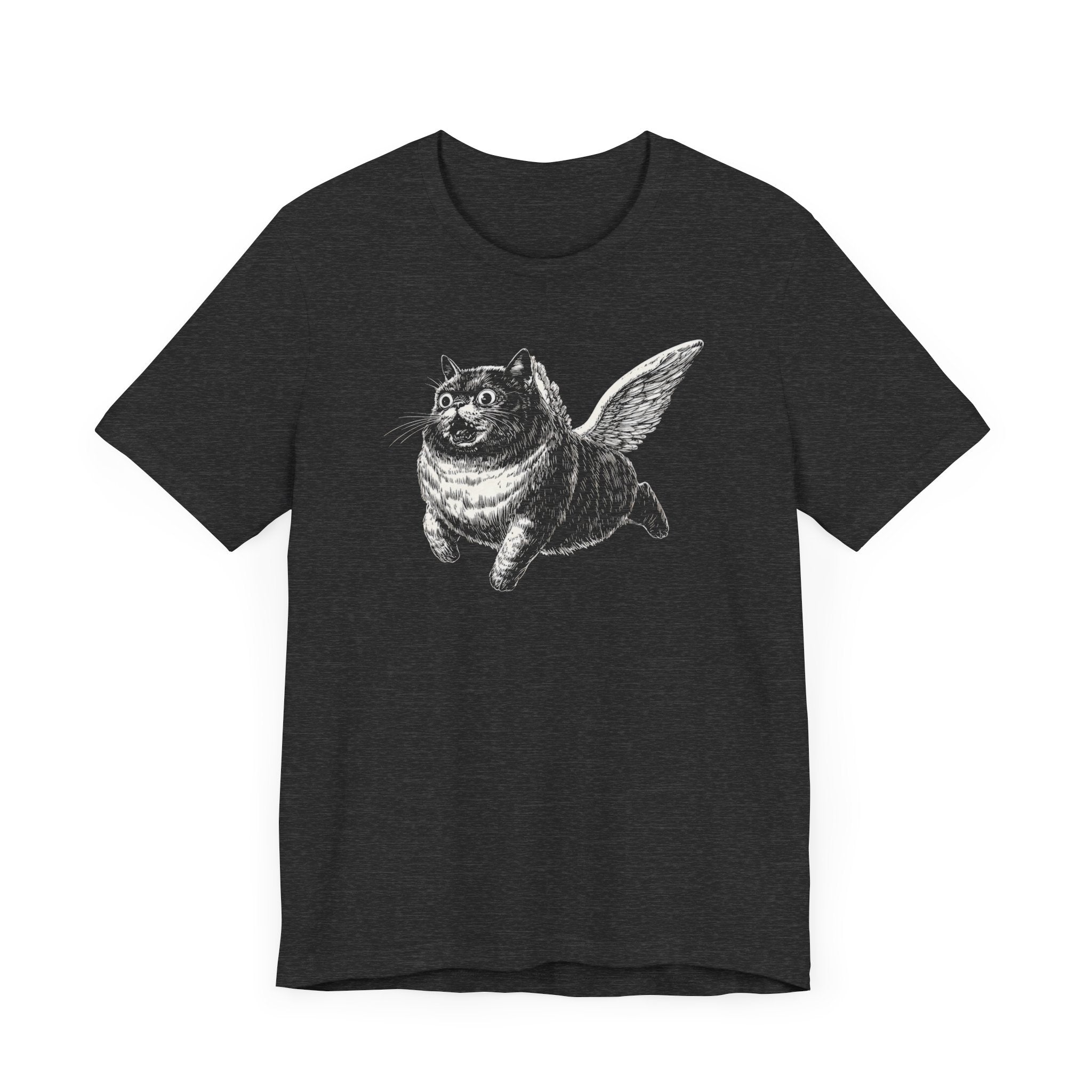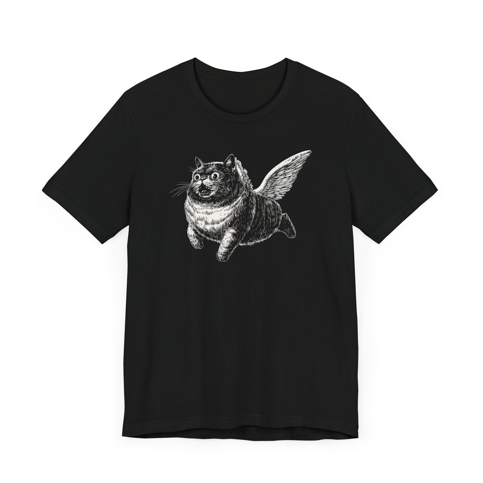 Embrace your whimsical side with this unique Flying Cat T-Shirt. Crafted from soft, breathable fabric, this black tee features a playful illustration of a cat with wings, adding a touch of humor and charm to your wardrobe. The classic fit ensures comfort, making it perfect for casual outings or lounging at home. Why You’ll Love It: 👕 Ultimate Comfort: Made with 100% Airlume combed and ring-spun cotton, this tee offers a lightweight (4.2 oz/yd² or 142 g/m²) and breathable fabric that’s perfect for both active and leisure wear. 👔 Versatile Style: The retail fit and classic crew neckline make this shirt perfect for casual outings and semi-formal settings alike. Accessorize easily to create your unique look! 👍 Durable Quality: Ribbed knit collars and tapered shoulders ensure a better fit over time, while dual side seams hold the garment’s shape longer, wash after wash. 🌱 Ethically Made: Bella+Canvas products are manufactured in the USA and internationally in a humane, no-sweat-shop, sustainable manner. Proudly part of the Fair Labor Association and Platinum WRAP certified. 🔖 No Irritation: Featuring a tear-away label for added comfort, say goodbye to annoying tags! Fabric Details: 🧵 Solid Colors: 100% Airlume combed and ring-spun cotton 🧵 Ash and Heather Prism: 99% Airlume combed and ring-spun cotton, 1% polyester 🧵 Heather and Solid Blends: 52% cotton, 48% polyester 🧵 Athletic Heather and Black Heather: 90% cotton, 10% polyester Perfect For: 🎁 Gift Giving: An excellent gift for birthdays, holidays, or any special occasion for cat and fashion lovers. 🌳 Everyday Wear: Whether you’re running errands, meeting friends, or just relaxing at home, this shirt is your go-to choice.