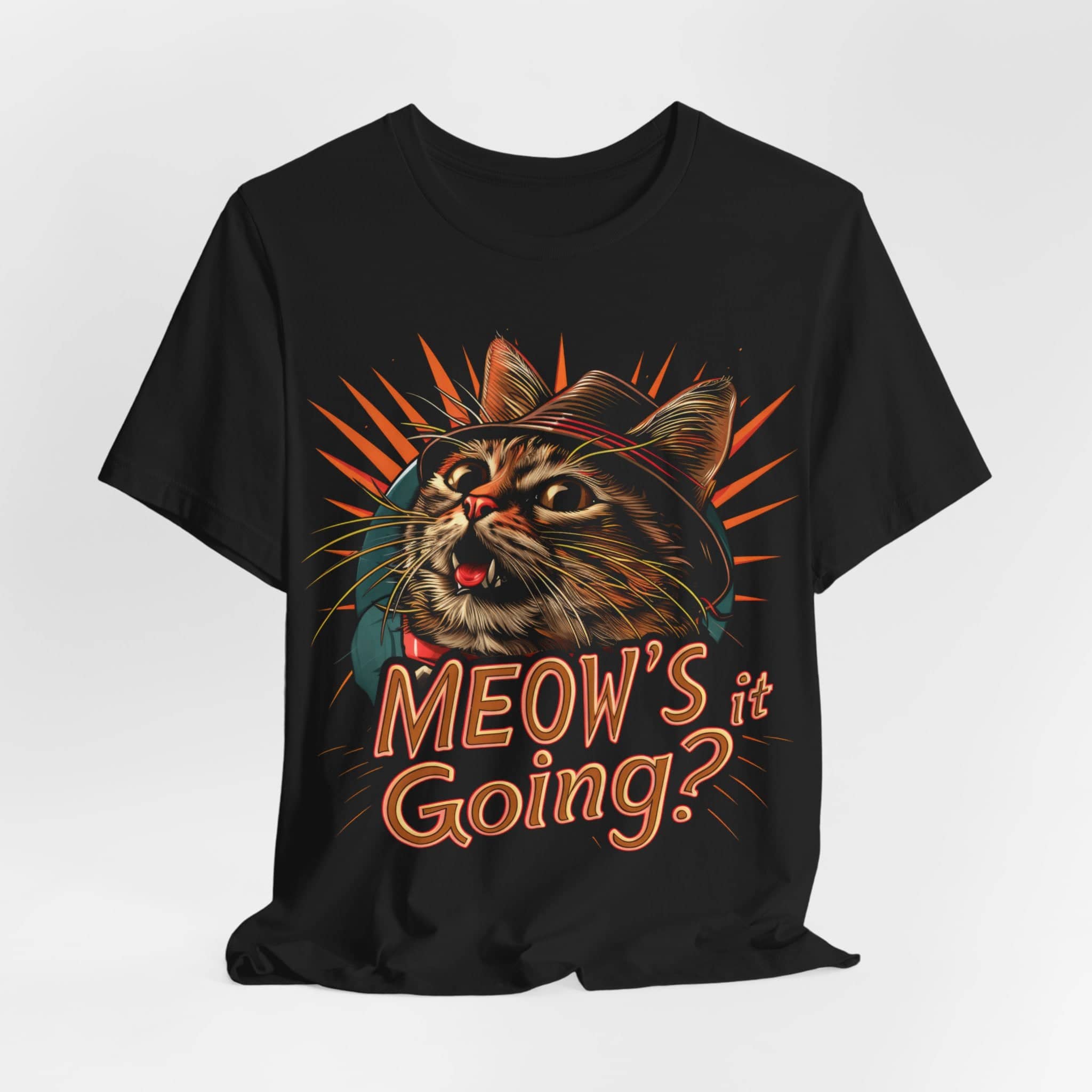 🐱 Add some purr-sonality to your wardrobe with our “Meow’s It Going?” Cat T-Shirt! This playful design features a cheeky cat wearing a hat, ready to greet you with a big smile. Perfect for cat lovers and anyone who enjoys a good pun, this tee is made from soft, high-quality fabric for ultimate comfort. Whether you’re out and about or lounging at home, this shirt is sure to make everyone smile! 😸❤️ This classic unisex jersey short sleeve tee fits like a well-loved favorite. Soft cotton and quality print make users fall in love with it over and over again. These t-shirts have-ribbed knit collars to bolster shaping. The shoulders are tapered for a better fit over time. Dual side seams hold the garment’s shape for longer. .: Made with 100% Airlume combed and ring-spun cotton, a lightweight fabric (4.2 oz/yd² (142 g/m²)) that is easy to layer, breathable. Perfect for active and leisure wear. .: The retail fit that is perfect for casual and semi-formal settings. The crew neckline adds a classic, neat style that’s perfect for accessorizing..: Bella+Canvas manufactures all its products in the US and internationally in humane, no-sweat-shop, sustainable way and is part of the Fair Labor Association as well as Platinum WRAP certified. .: The tear-away label minimizes skin irritations..: Fabric blends: Ash and Heather Prism colors – 99% Airlume combed and ring-spun cotton, 1% polyester; Heather and Solid Blend colors – 52% cotton, 48% polyester; Athletic Heather and Black Heather – 90% cotton, 10% polyester.