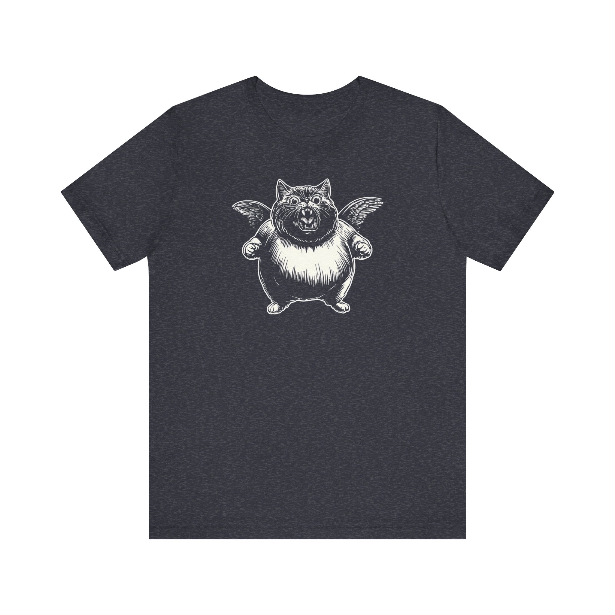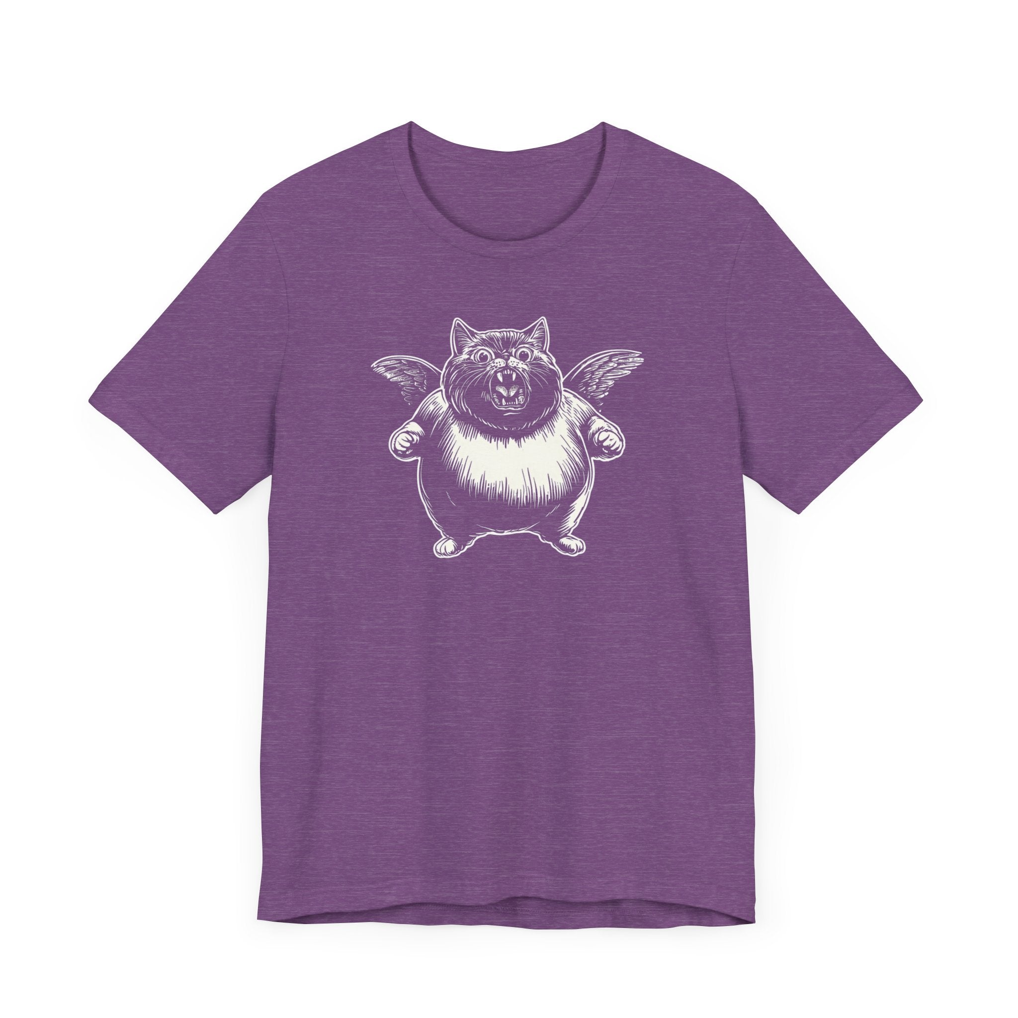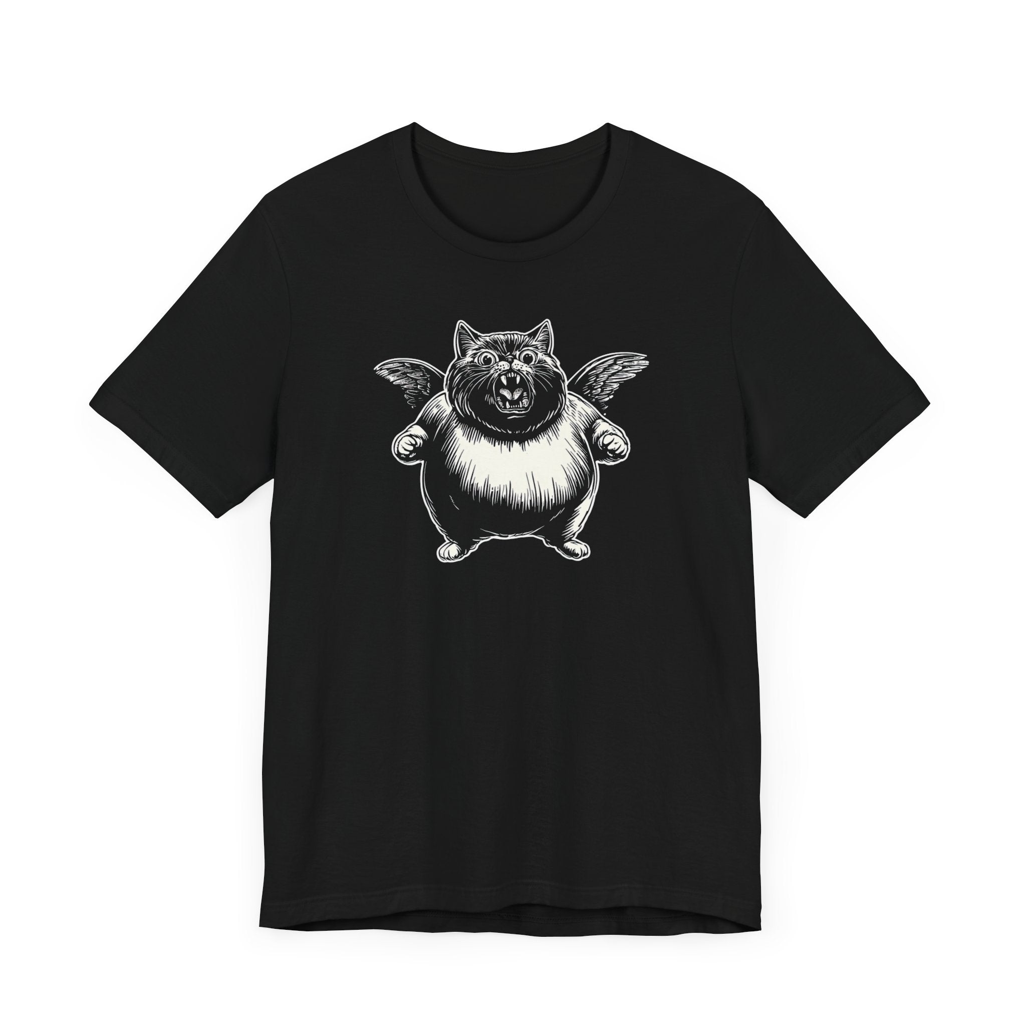 Embrace your playful side with this unique black t-shirt featuring a charming illustration of a winged cat. The striking design showcases a plump, adorable feline with whimsical wings, perfect for adding a touch of fun to your wardrobe. Crafted from soft, breathable fabric, this tee ensures comfort while making a bold statement. Why You’ll Love It: 👕 Ultimate Comfort: Made with 100% Airlume combed and ring-spun cotton, this tee offers a lightweight (4.2 oz/yd² or 142 g/m²) and breathable fabric that’s perfect for both active and leisure wear. 👔 Versatile Style: The retail fit and classic crew neckline make this shirt perfect for casual outings and semi-formal settings alike. Accessorize easily to create your unique look! 👍 Durable Quality: Ribbed knit collars and tapered shoulders ensure a better fit over time, while dual side seams hold the garment’s shape longer, wash after wash. 🌱 Ethically Made: Bella+Canvas products are manufactured in the USA and internationally in a humane, no-sweat-shop, sustainable manner. Proudly part of the Fair Labor Association and Platinum WRAP certified. 🔖 No Irritation: Featuring a tear-away label for added comfort, say goodbye to annoying tags! Fabric Details: 🧵 Solid Colors: 100% Airlume combed and ring-spun cotton 🧵 Ash and Heather Prism: 99% Airlume combed and ring-spun cotton, 1% polyester 🧵 Heather and Solid Blends: 52% cotton, 48% polyester 🧵 Athletic Heather and Black Heather: 90% cotton, 10% polyester Perfect For: 🎁 Gift Giving: An excellent gift for birthdays, holidays, or any special occasion for cat and fashion lovers. 🌳 Everyday Wear: Whether you’re running errands, meeting friends, or just relaxing at home, this shirt is your go-to choice.